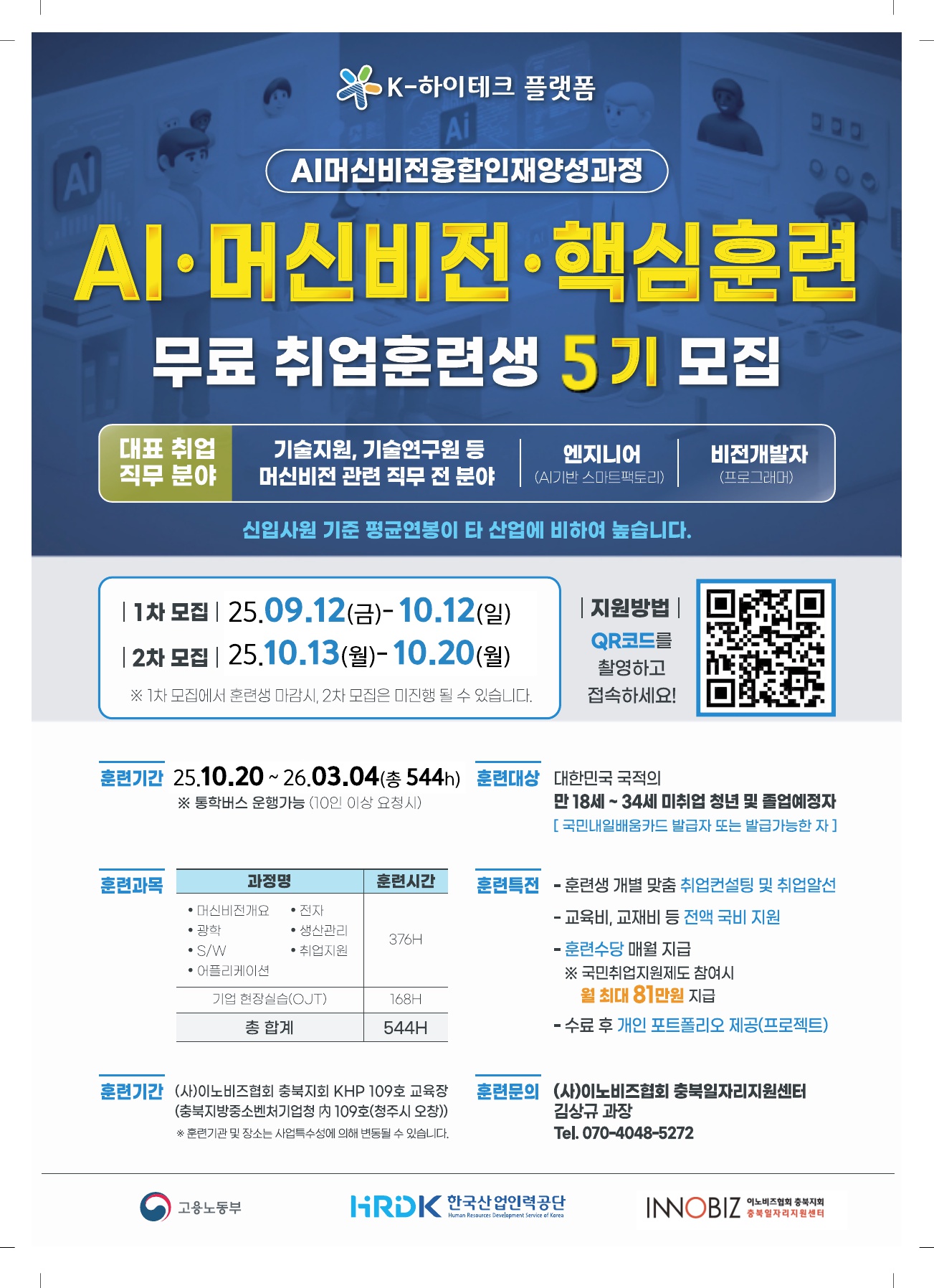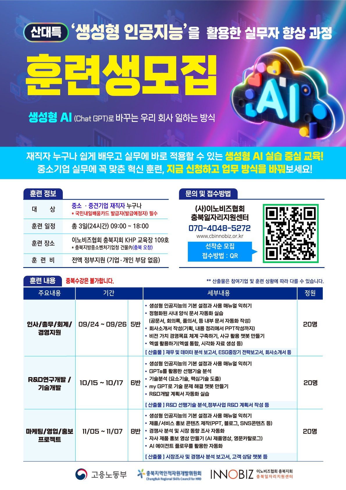 많은 관심과 적극적인 참여 부탁드립니다. [1.구직자(전공무관)] AI 머신비전 융합인재 양성과정 AI 머신비전 산업에 특화된 실무 취업연계형 국비훈련 - 신청링크 : https://docs.google.com/forms/d/e/1FAIpQLSc_FLyUGO5yKMrsOYzBfJ-U3K83SPO5faZ3m-DVxDnkkjTp_w/viewform [2. 재직자] (산대특) 생성형AI 활용 실무자 향상 과정 기업 경영지원ㆍ마케팅ㆍR&D 관련 부서에서 바로 쓰는 생성형 AI 실습형 교육 - 신청링크 : https://docs.google.com/forms/d/e/1FAIpQLSdG47LWcF_yKcKTM53tsG4VOatylB5xE-kPrxZwLKAobAGuWA/viewform ■ 문 의 처 : (사)이노비즈협회 충북지회 043-715-2883 ※ 자세한 사항은 첨부파일 및 문의처 문의 바랍니다. |