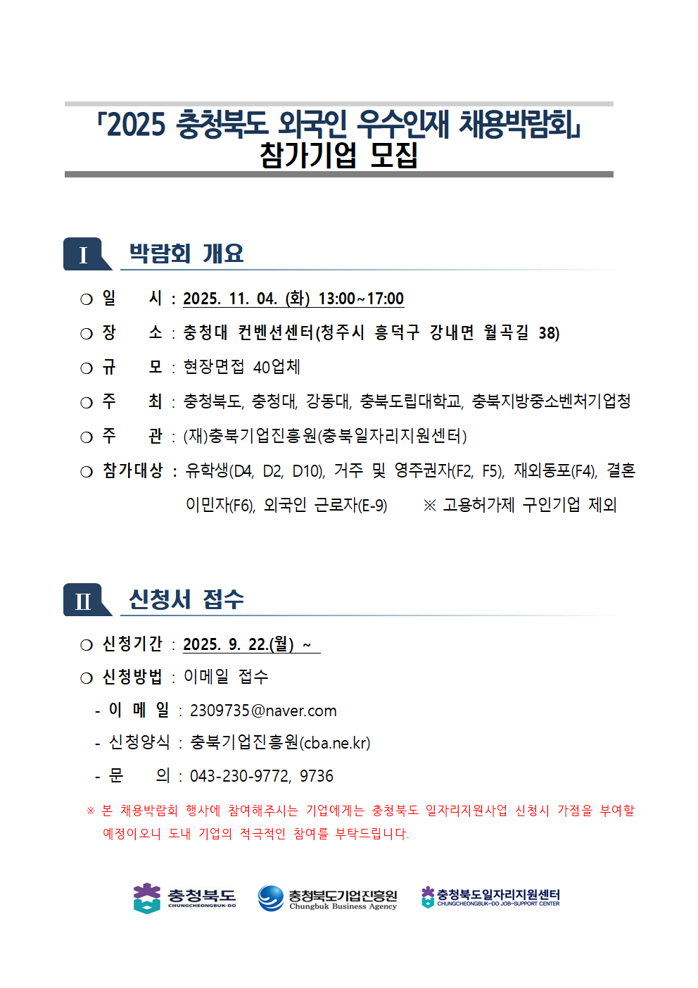충청북도와 충청북도기업진흥원(충북일자리지원센터)에서『2025 충청북도 외국인 우수인재 채용박람회』를 개최합니다.