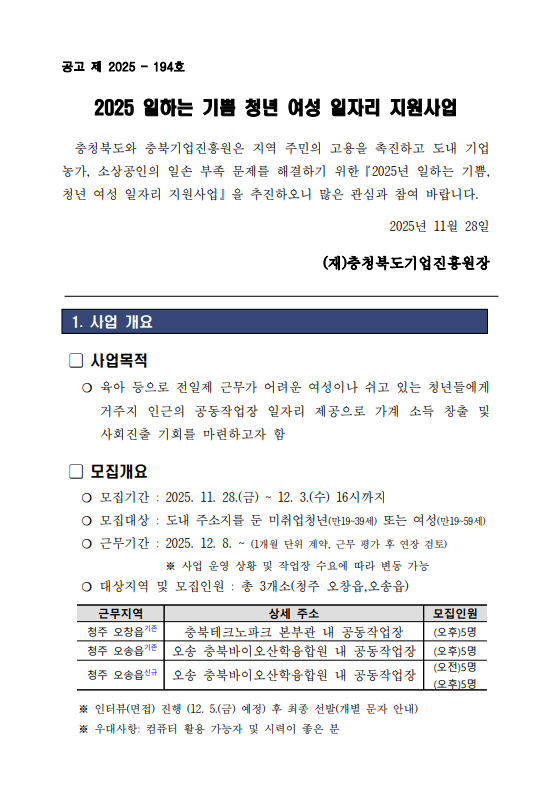 2025년 일하는 기쁨 청년 여성 일자리 지원사업 모집공고(청주)